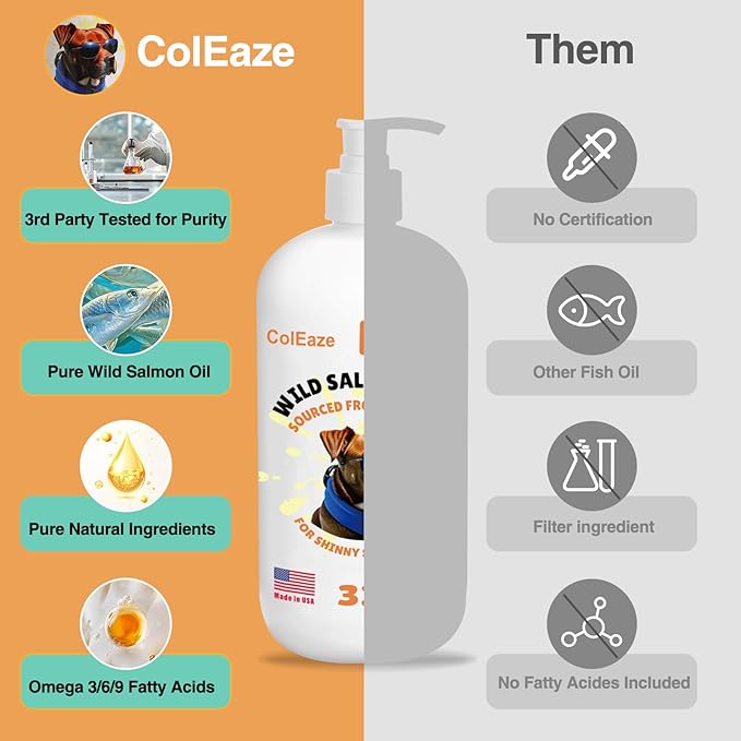 - PREMIUM SUPPLEMENT: High-quality salmon oil supplement for dogs containing essential Omega 3 fatty acids EPA and DHA for optimal health support,Salmon oil for dogs helps relieve dry, itchy skin, reduce shedding, and calm irritation from seasonal allergies.This fish oil for dogs skin and coat delivers visible results softer fur, fewer hot spots, and less scratching making it a must have dog supplement for dry skin and coat.