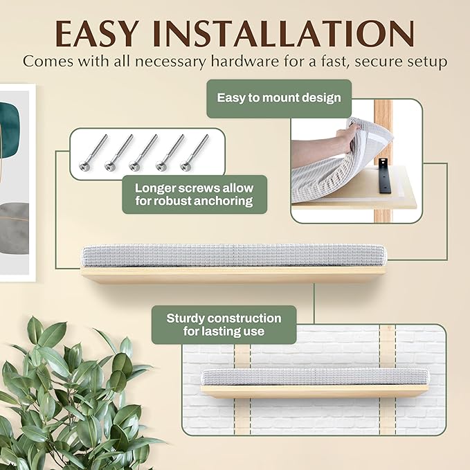 - EASY & SECURE INSTALLATION– The wall-mounted cat shelf mounts easily into 16" wall studs with included hardware, ensuring a sturdy cat wall perch. Perfect for creating a cat climbing wall or wall-mounted cat shelves set. Designed for hassle-free installation, this wall-mounted cat perch includes heavy-duty hardware and step-by-step instructions for mounting onto drywall, brick, or concrete. Hidden mounts maintain a sleek, modern look.