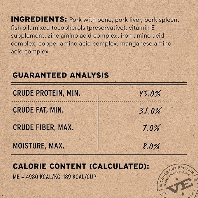 - SOFT NIBS FREEZE-DRIED RAW PORK CAT FOOD: Vital Essentials Freeze Dried Cat Food packs more protein than industry standard into every soft bite to deliver the peak vitality your cat deserves, especially when compared to dehydrated cat food. Our complete and balanced freeze-dried raw cat food is made with Butcher Cut premium pork, responsibly sourced in the USA.