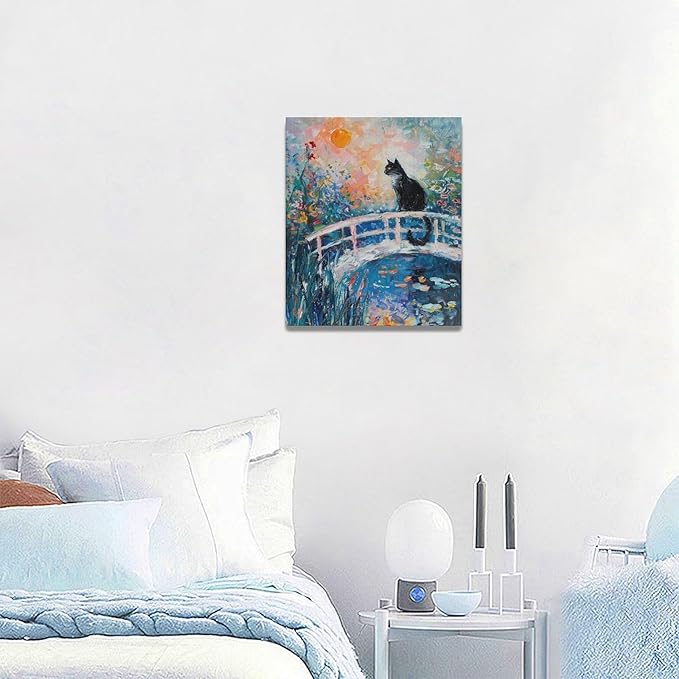 Quorin Black Cat Wall Art Water Lily Sunset Pictures Cat Wall Decor Impressionism Canvas Print Painting Artwork for Bathroom Living Room Bedroom 20"x24"