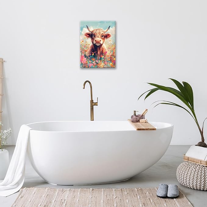Highland Cow Wall Art Canvas Flower Cattle Wall Decor Prints Framed Painting Animal Pictures Gifts Artwork for Bathroom Living Dining Kitchen 16"x20"