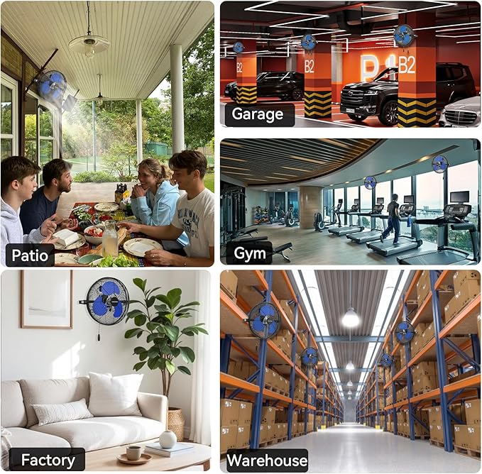 - Durable Constructions: Fanniverse wall mounted fan is made from tough powder coated steel housing and thick rust-resistant grille. Premium TEAO ball bearing motor. Extra-long 6 FT SJT waterproof power cord with 2 storage hooks. 0.55 AMPS, 2800 CFM, 120V, 62 Watts, 60 Hz, 1/10 HP. Meets OSHA and UL507 standards. UL safety listed.
