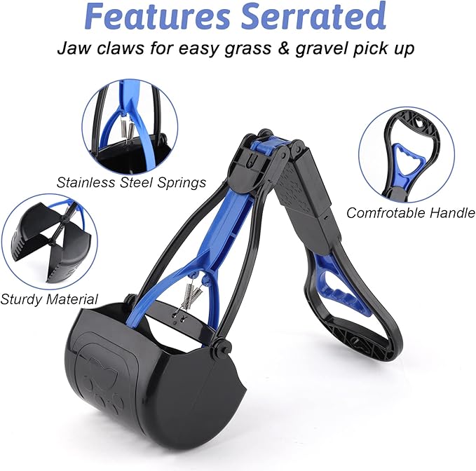 - 【Strong Claws & Easy Clean】 Strong bucket close up tight, with suitable distance of strong serrated teeth, Easy to Pick up waste from grass, concrete, gravel, dirt water, and variety of surfaces. Large-capacity for large dogs, medium dogs and small dogs, cat and other pets. Non-stick plastic bucket and sleek design ensures very easy to rinse. Clean up the backyard, pick up fruits and other items.