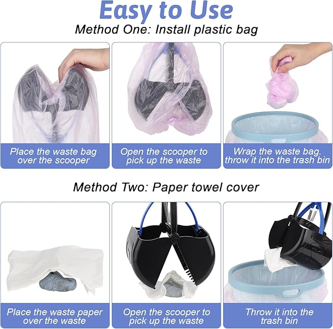 - 【Ergonomic Comfortable Design】One-handed operation, Easy-pull handle and two durable Stainless steel spring guarantee your effortless scooping action. 24.3inch length long handle ensures that most people don't have to bend down to clean up easily, keeps you away from all the messes and stink, no need to touch dirty things with your hand.