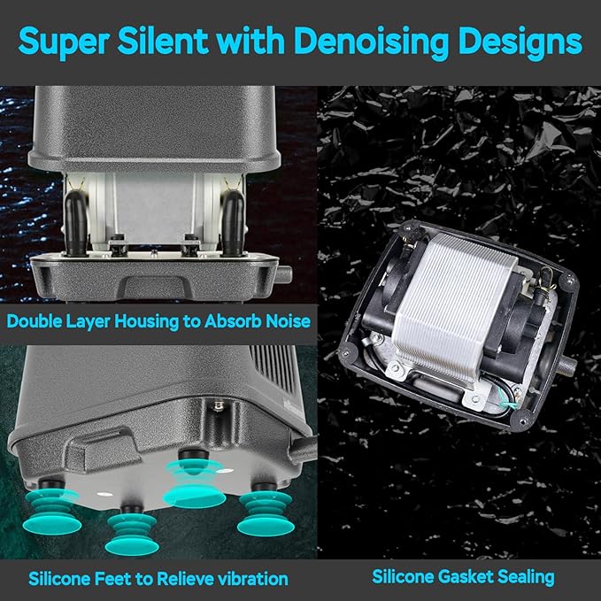 - SPECIFICATION - This linear air pump delivers a max of 1600GPH powerful airflow at 0.035MPa pressure with an 60W energy-efficient copper coil motor that runs in stable operation and lasts longer. Perfect as a pond aerator, septic aerator, hydroponic air pump, or aquarium air pump, it provides high efficiency, low heat and low power consumption.