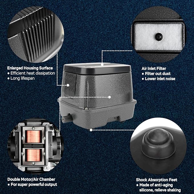 - GREAT HEAT DISSIPATION - The enlarged housing and optimized design of this septic air pump ensure superior heat dissipation, preventing overheating even during 24/7 operation. Keeps internal components at lower temperatures to extend pump life.