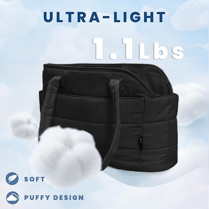 - Ultra-Light & Stylish Puffy Design: Weighing just 1.1 lbs, this chic puffy dog carrier is crafted from ultra-light materials with a fashionable quilted exterior. The removable padded hard-bottom base provides strong, stable support. Perfectly sized at 17"L x 8"W x 12"H to comfortably carry small dogs up to 15 lbs (6.8 kg)โideal for Chihuahuas, Yorkies, puppies, and other toy breeds.
