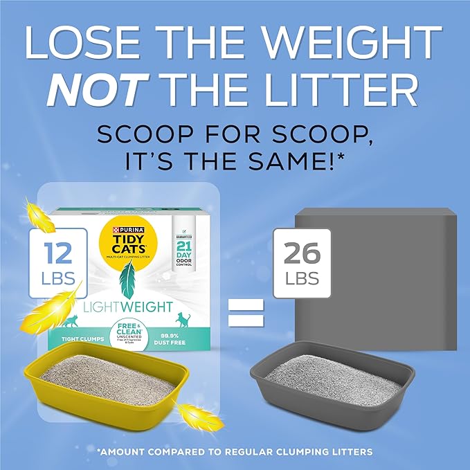 - LIGHTER CAT LITTER: Tidy Cats lightweight cat litter formula is 50 percent lighter than the leading clumping litter--less weight, not less litter.