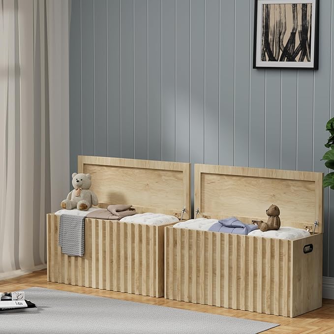 - Detailed Design: Our storage chest is equipped with 2 advanced safety hinges. With the ability to park in any position, it opens and closes slowly to avoid pinching fingers. Meanwhile, 2 wide cut-out side handles that are hand-friendly, it's convenient and effortless to move this storage trunk to wherever you need extra storage or seating