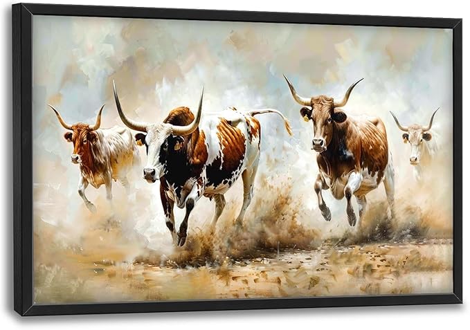 - 【Unique Design】A group of longhorn cattle running through the Texas desert, with detailed brushstrokes capturing their powerful motion and unique features, in an oil painting style with soft colors and dynamic lighting.