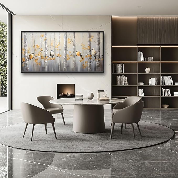 - 【Unique Design】Abstract painting of silver birch trees with birds, yellow leaves, white background, gold accents, soft lighting, neutral tones, modern style, wide frame, oil on canvas, brush strokes, elegant composition, nature-inspired artwork.