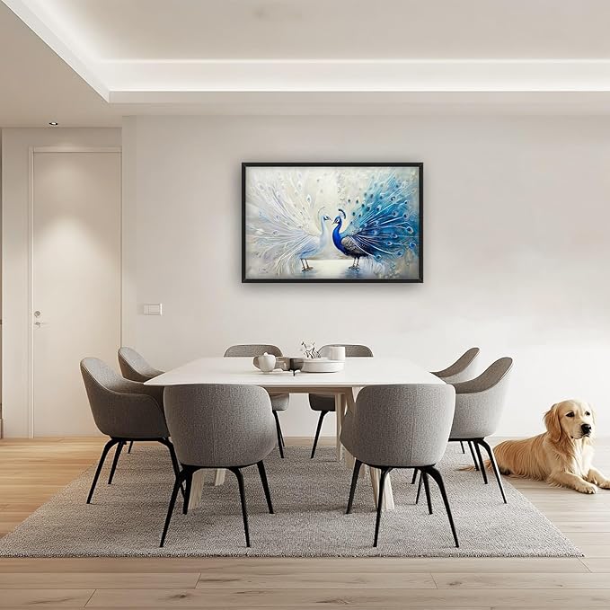 - 【Unique Design】Blue and white peacock painting, oil on canvas, two beautiful peacocks with long tails, white feathers spread out in the background, exquisite feather details, elegant posture, gorgeous colors, symmetrical composition, soft lighting, and romantic atmosphere. The background is blurred to highlight the theme of the peafowl.