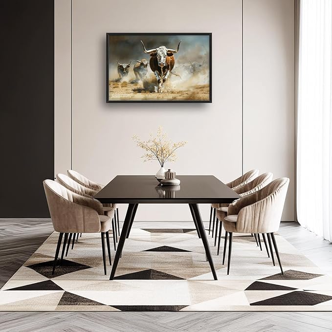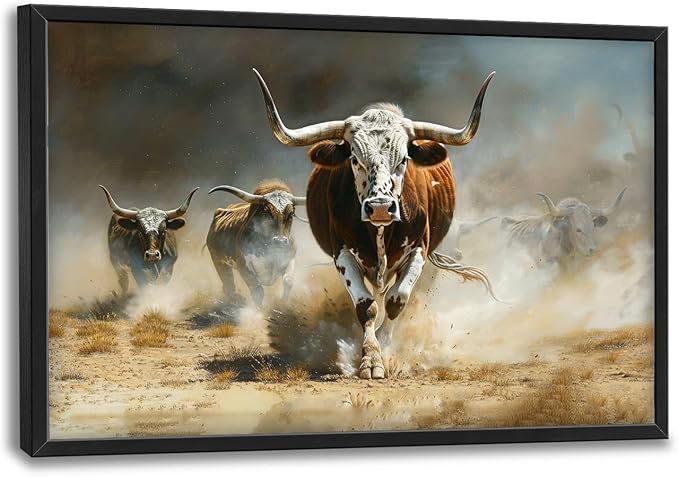 - 【Unique Design】An oil painting of longhorn cattle running through a dusty landscape, realistic and cinematic in style.