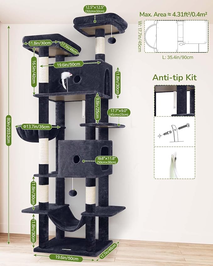 Globlazer Large Cat Tree Tower Condo, 80in Tall Cat Tree for Multiple Indoor Cats Large Adult, XXL Big Cat Climbing Tower with Cat Caves, Sisal Scratching Posts, Top Perches, Hammock, S80B, Dark Gray