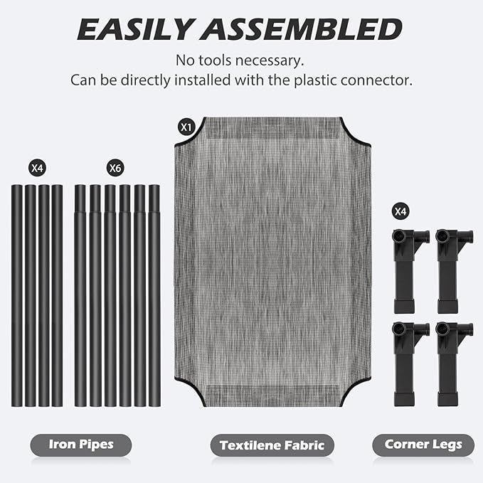 - Easy to Install: The cooling dog cot can be installed without the use of any tools, screws and can be installed directly with the plastic connector. It only takes a few minutes of your time, and presto. It's up and ready for your pet to enjoy in. Perfect for any indoor space or outdoor adventure.