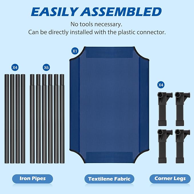 • Easy to Install: The cooling dog cot can be installed without the use of any tools, screws and can be installed directly with the plastic connector. It only takes a few minutes of your time, and presto. It's up and ready for your pet to enjoy in. Perfect for any indoor space or outdoor adventure.