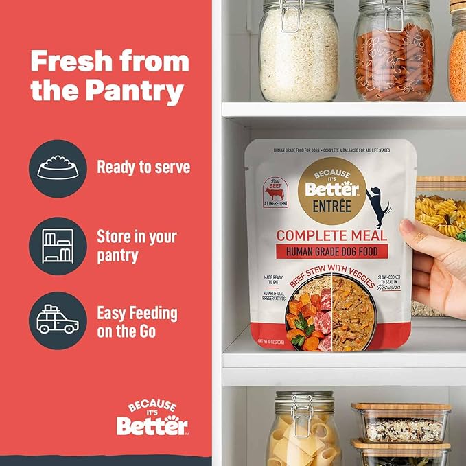Because it's Better Entrée Complete Meal, Beef Stew with Veggies, Human Grade Wet Dog Food, 10 oz Pouches, 6 Count