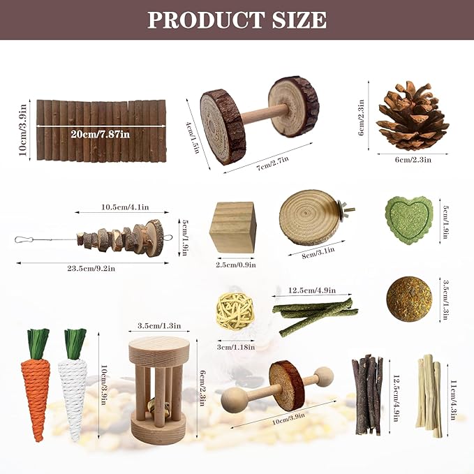 - 【Hamster chew toys sets】Our hamster chew toy set includes: 1* apple branch molar skewer, 4.1*1.9in. 1* bendable wooden bridge, 7.8*3.9in. 1* unicycle, 3.9*1.7in. 2*Rattan ball,1.1in. 20g apple twig,4.7in. 3*grass stick,4.9in. 1*Bell Roller,2.4*1.4in. 2*Grass Carrot Toy,3.9in. 50g* sweet bamboo, 4in. 1*timothy hay cake,1.4in. 1*timothy hay ball teeter,1.9in. 1* chinese pine,2.3*1.9in. 1* Wooden Dumbbells,2.7*1.5in. 1*Round Wooden Standing Platform,3.1in. 2*Wooden molar blocks,0.98*0.98in.
