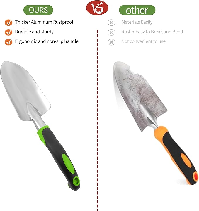 - 🌷DURABLE, HIGH-QUALITY HAND TOOLS – This set includes a hand trowel, transplanter, rake, fork, and weeder, all made from premium rust-resistant metal with ergonomic anti-slip handles to maximize comfort and durability.