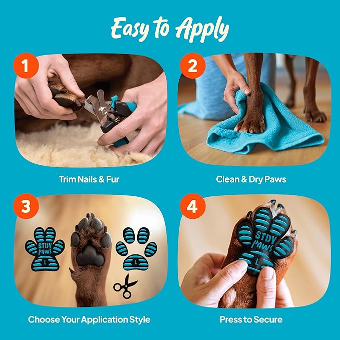 - EASY APPLICATION & CUSTOM FIT: Trim paw fur before applying for best adhesion. Pads can be cut to fit your dog’s paw shape and size. Just peel, stick and go - no tools or mess required.
