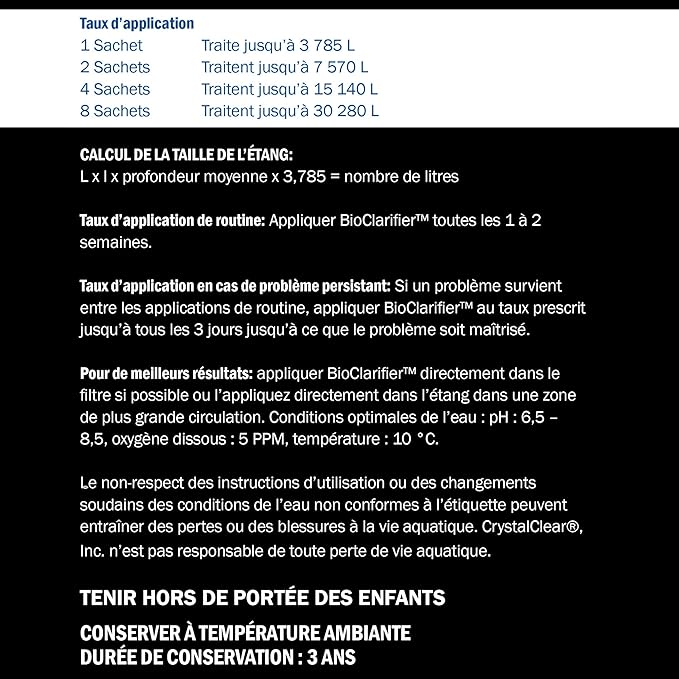 - Concentrated Formula -- BioClarifier comes in easy-to-use water-soluble packets and can be used in ponds, water gardens, fountains, and waterfall features. One packet treats up to 1,000 gallons.