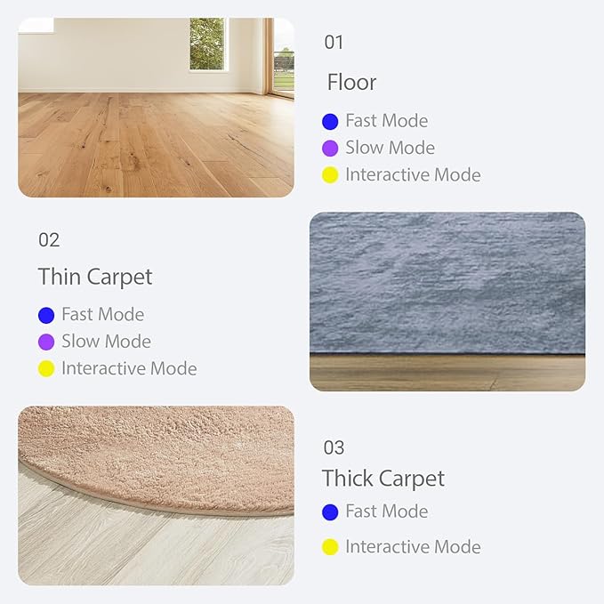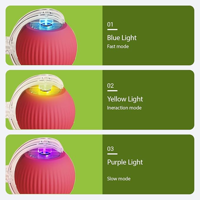 - Three Interaction Modes: Cat toys for indoor Cats has three modes, fast mode (Blue lights) rolls fast on high rug, slow mode (Purple lights) moves well on floor, Interactive mode (Yellow lights) only moves when nudged by your cats. Short press to switching working mode, and distinguish via the color of the light
