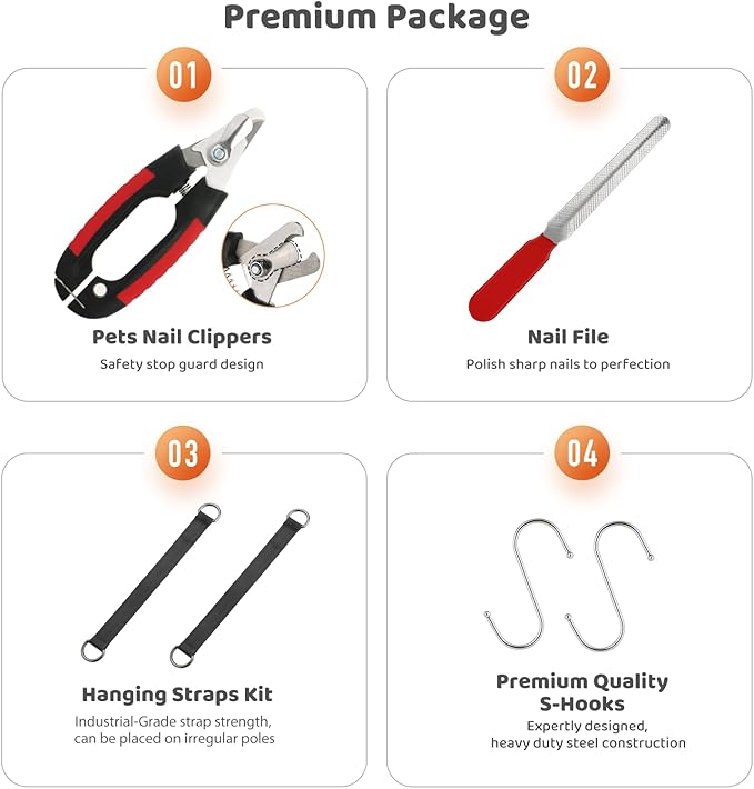 - π [ Professional Grooming Kit ]: Includes a safety-stop dog clippers for nails, a nail file, two premium S-hooks, and two dog sling for a complete dog grooming harness solution.