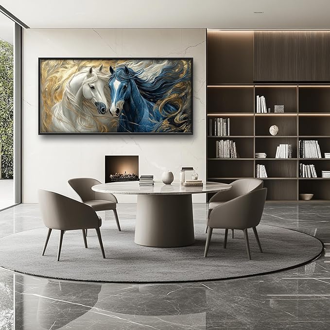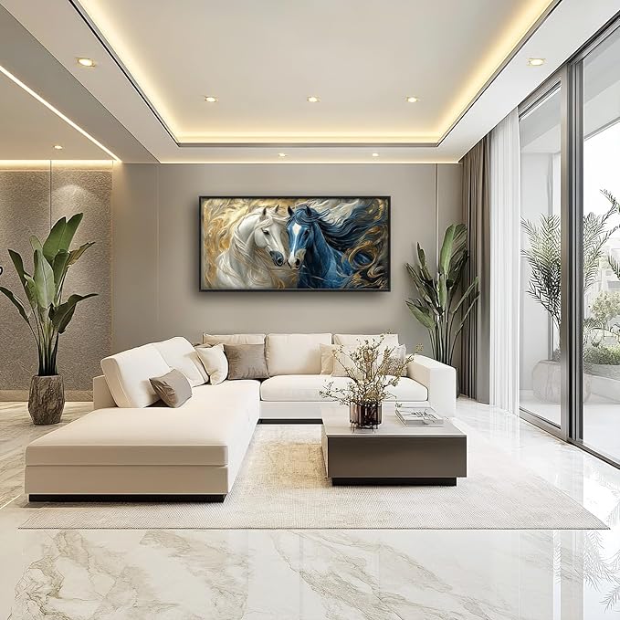 Framed Large Horse Wall Art for Living Room, Oversized Abstract Horses Wall Decor Blue and Golden Canvas Painting Animal Pictures Modern Artwork for Living Room Bedroom Office 60"x30"