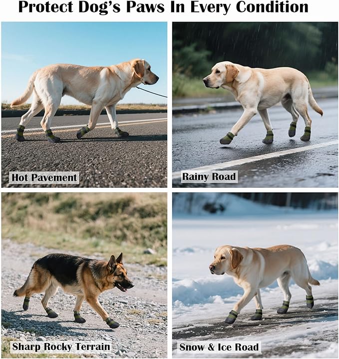 - [All-Weather Paw Protection]: Whether you’re navigating slippery floors, hot pavement, snowy trails, or rocky paths, our dog boots have you covered. The high-visibility reflective edges ensure safety during nighttime walks, making sure your furry friend stands out!