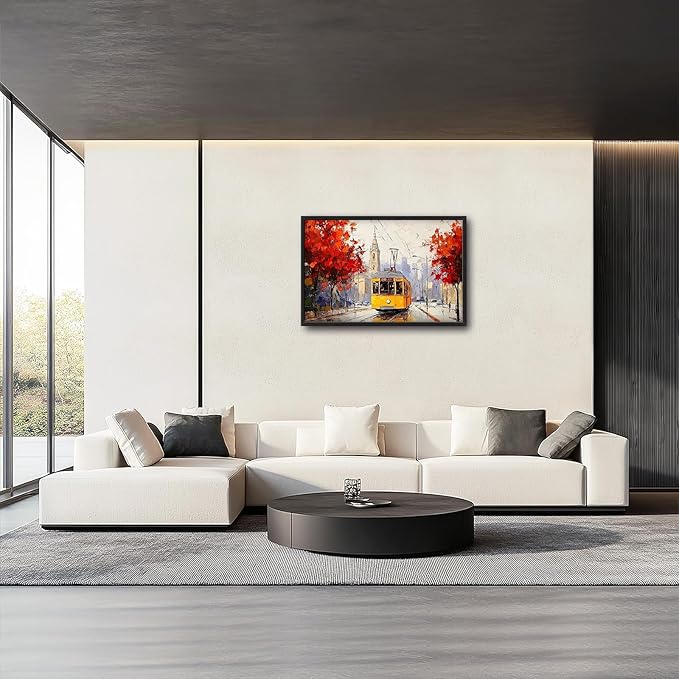 Large Cityscape Wall Art for Living Room, Framed Oversized Urban Tram Wall Decor Tree Landscape Canvas Painting Modern Artwork for Living Room Bathroom Bedroom Office Dining Room 36"x24"