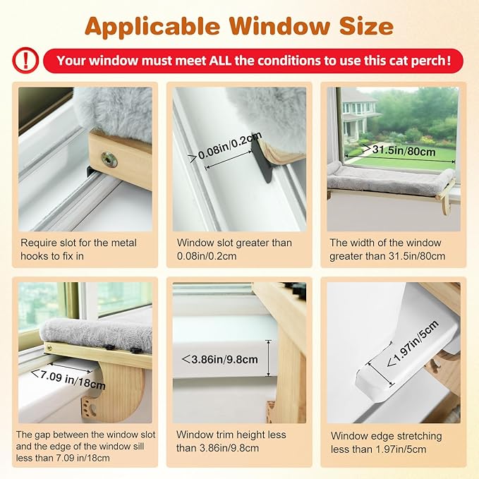 - Applicable Window Type: Before purchasing, make sure to measure the size of the window to ensure compatibility between the window sill and cat perch. <1>There must be a slot greater than 0.08in/0.2cm at the window. <2>The width of the window greater than 31.5in/80cm. <3>The gap between the window slot and the edge of the window sill less than 7.09 in/18cm. <4>Window trim height less than 3.86in/9.8cm. <5>Window edge stretching less than 1.97in/5cm