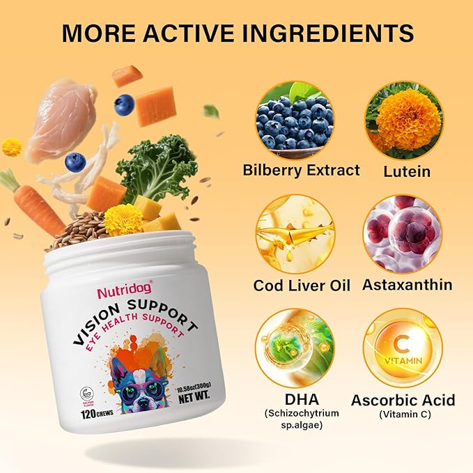 - ADVANCED EYE HEALTH FORMULA WITH COD LIVER OIL & ANTIOXIDANTS - Nutridog Eye Supplements deliver 12 essential nutrients including DHA from algae, Bilberry Extract, and Lutein to combat oxidative stress and reduce inflammation. Scientifically formulated to support retinal function and shield against UV damage, these soft chews target cataracts, dry eyes, and conjunctivitis while promoting long-term ocular resilience. Ideal for aging dogs or breeds prone to vision decline