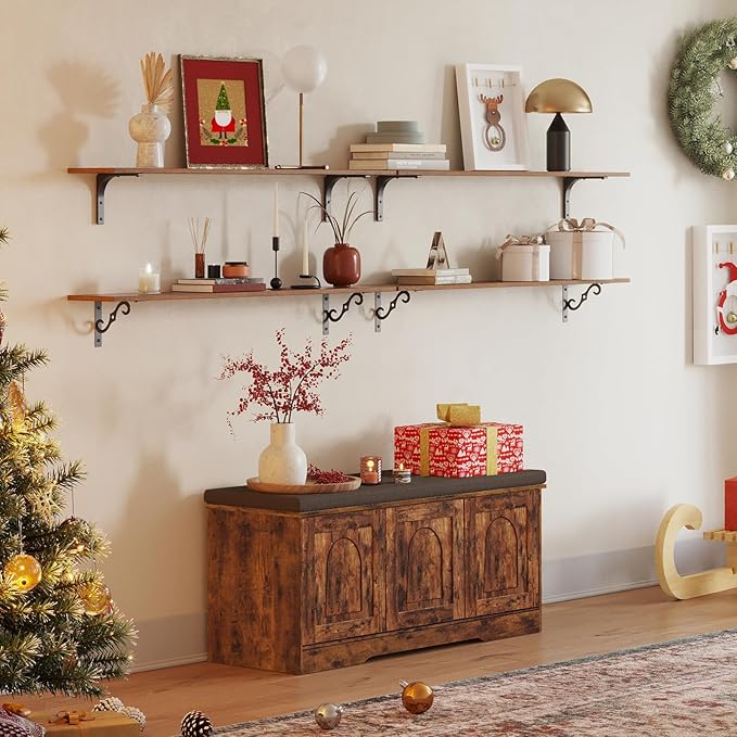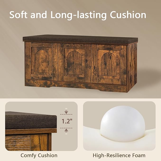 DINZI LVJ Shoe Bench, Entryway Storage Bench with Doors, Cushion, 2-Tier Shoe Rack with 6-Cubby, 39.4”L x 13.8”W Shoe Organizer Cabinet, Adjustable Shelf, Living Room, Bedroom, Rustic Brown