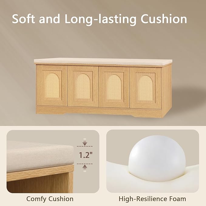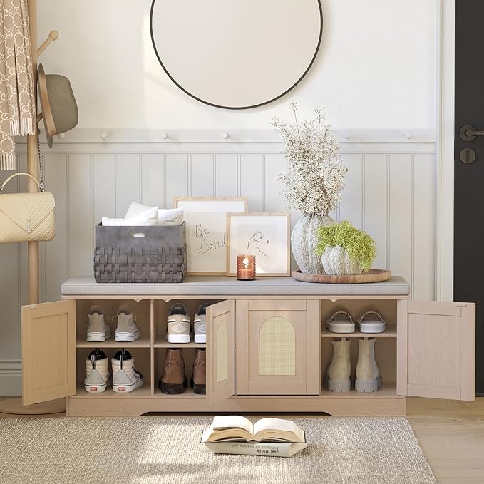 DINZI LVJ Shoe Bench, Entryway Storage Bench with Doors, Cushion, 2-Tier Shoe Rack with 8-Cubby, 47.2”L x 13.8”W Shoe Organizer Cabinet, Adjustable Shelf, Living Room, Bedroom, Natural with Rattan