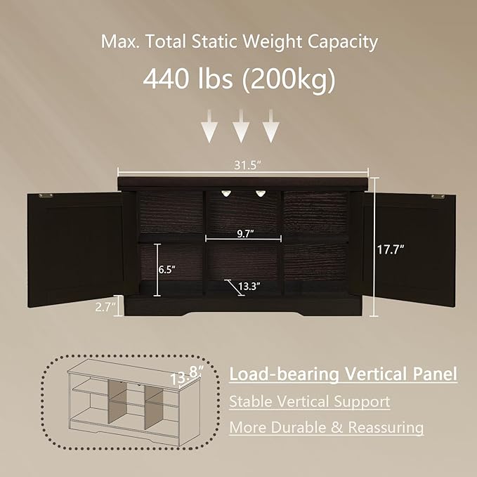 DINZI LVJ Shoe Bench, Entryway Storage Bench with Doors, Cushion, 2-Tier Shoe Rack with 6-Cubby, 31.5”L x 13.8”W Shoe Organizer Cabinet, Adjustable Shelf, Living Room, Bedroom, Espresso