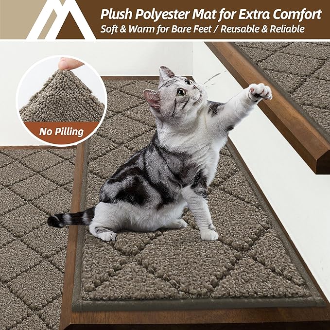 COSY HOMEER Stair Treads for Wooden Steps 9"x28" Washable Indoor Carpet Stair Treads Non Slip Soft Polyester Stair Carpet Tread Reusable Stair Runner Rugs for Kids, Elders,Pets,Light Brown,15pcs