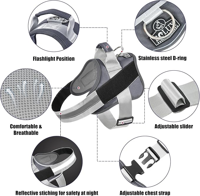 - OUTDOOR HEALTHY: Puppy no pull dog harness with reflective straps to ensure your dog is highly visible and keep dogs safe at night. You can connect the dog leash on the D-ring and with handle is easy to control on crowded streets. The high-end pet harness is perfect for daily walking, running, hiking, training, hunting, outdoor adventure and more!