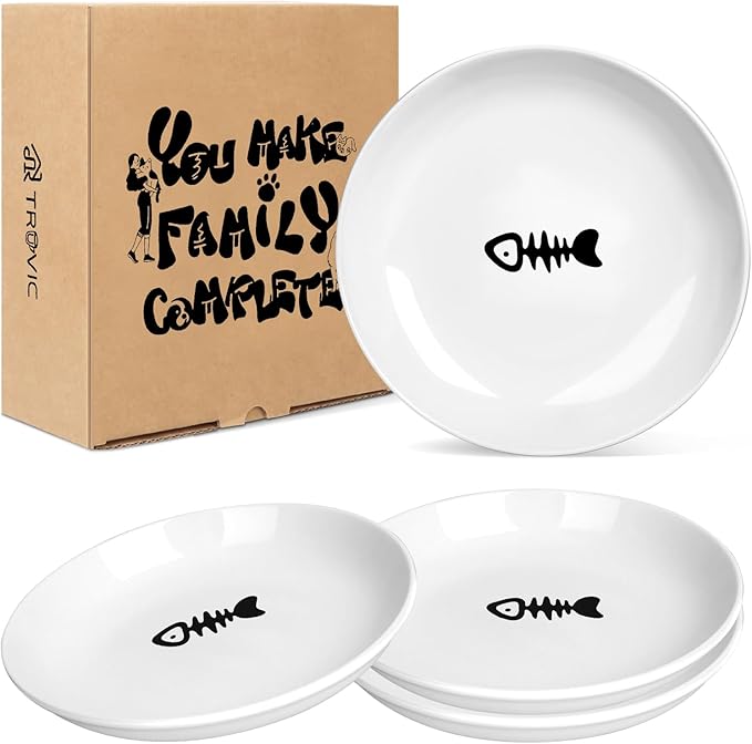 TRUVIC 4 Pack Ceramic Cat Food Bowls, 5.9 Inch Ceramic Cat Dishes Set for Indoor Cats and Small Dogs, Anti Whisker Fatigue Kitten Bowls, Wide Shallow Kitten Plates for Food and Water (Fishbone)