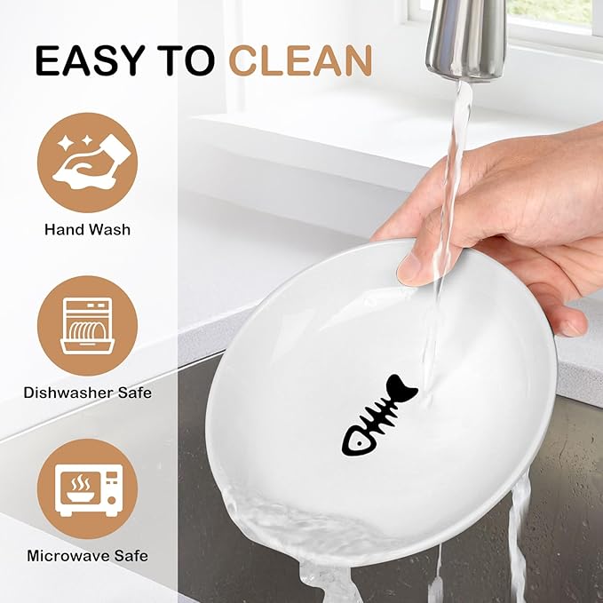 - Cute Fishbone Design: Adorable cat food bowls feature a fishbone print, sparking joy at mealtime for indoor cats. Made of premium ceramic bowls with food-grade glaze that meets human tableware standards. Vibrant colors withstand 800+ dishwasher cycles without fading. This 4-pack offers dedicated bowls for wet/dry food, water, and treats – perfect for multi-cat homes while preventing flavor transfer.