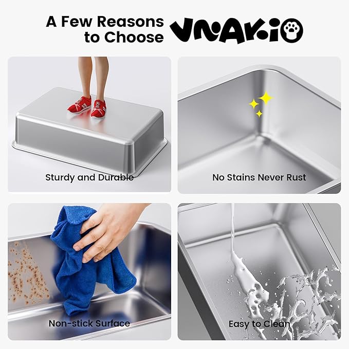 - 【CHOICE FOR HIGH PEEING CAT】 Tired of dealing with issues like cat urine spraying and scattered litter? Our 12" high sided litter box prevents urine from seeping out of the seams, while also containing litter splashes during digging. With its secure clasp design, this stainless steel litter box stays in place even during your cat's most energetic moments, saving you valuable time on daily clean-ups.