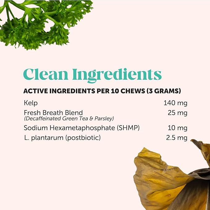 - MADE WITH CLEAN & SCIENCE-BACKED INGREDIENTS: Powerful postbiotics promote a healthy oral microbiome & overall dental health. Kelp naturally fights plaque, tartar, & bad breath. Plus our dental bites are PhD crafted & pet preferred.