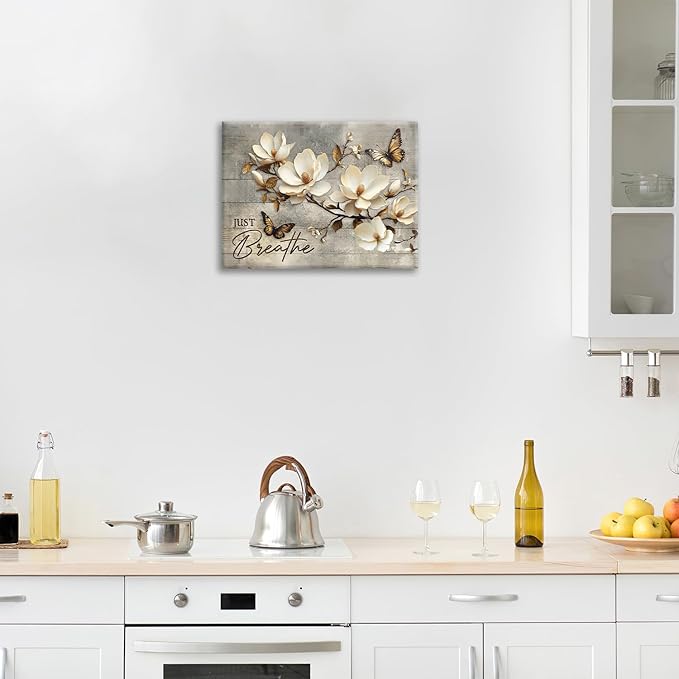 Floral Magnolia Bathroom Pictures Wall Art, Just Breathe Bathroom Wall Decor, Flower Butterfly Framed Painting Canvas Artwork for Bedroom Living Room Decorations 16"L x 12"W