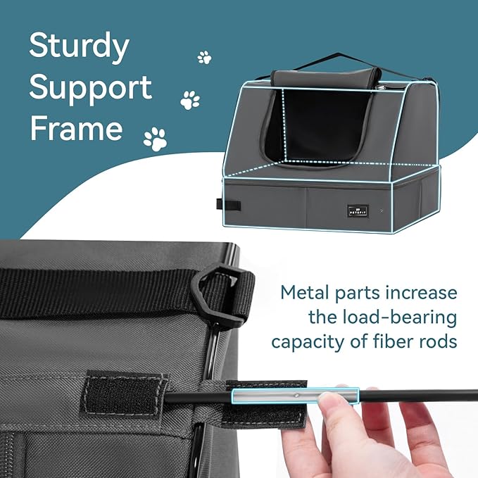 - Sturdy Support Frame: the travel litter box for cats is roomy(17" Lx13" Wx12.5" H) and durable, for the edges of the litter box, we use a rubber bone, and for the top, we employ fiber rods. In the middle of the fiber rods, we incorporate metal parts to ensure that the entire litter box is not only sturdy on the outside but also remains robust and does not collapse when the cat is digging in the litter inside.