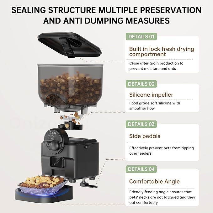 - App Remote Control with Stable 2.4G WiFi Programmable automatic feeding system simplified . Easily set up feeding times, portion sizes, and monitor your petโs feeding history. Use the app to control portions, timed release schedule meals (up to 10 timed feeds/day with 1-12 portions per meal), Compatible with 2.4G WiFi (not 5G) for reliable remote access from your phone controlled or tablet.