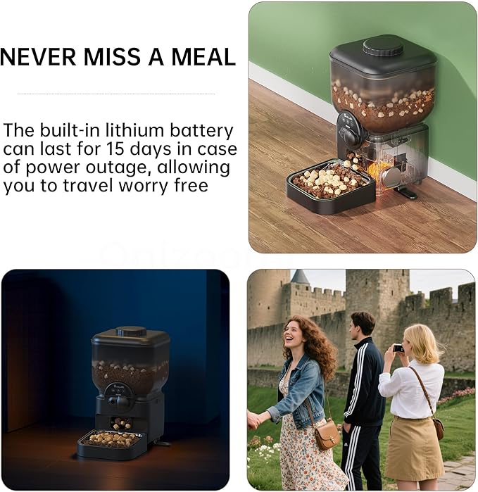 - Ensures Continuous Feeding with Dual Power Sources : USB and Rechargeable Battery This electric auto feeder uses dual powerโUSB or battery-backup operated (provides power supply for 15 days ). Ideal for outdoor/indoor use, power outages, on business trip or travel.The gravity-based dispensing system ensures a steady food delivery even during power outages.