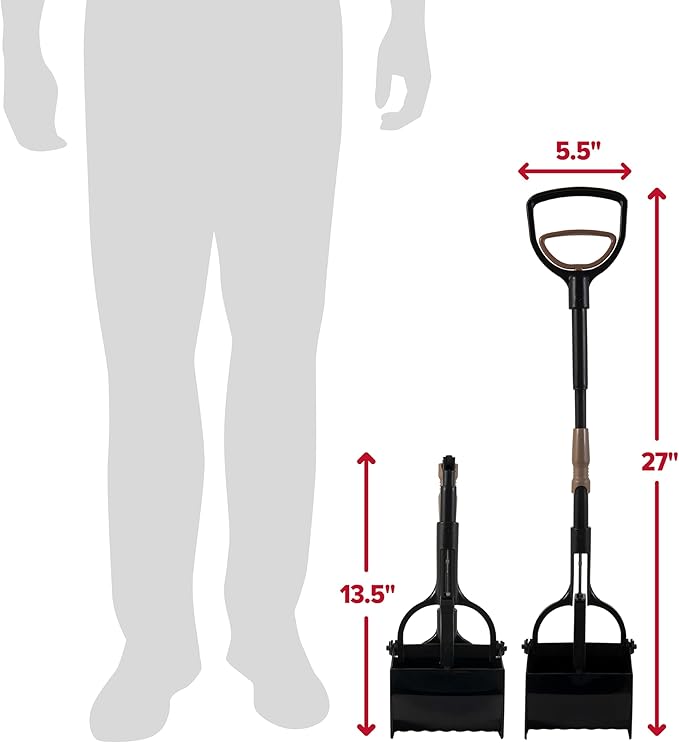 - No More Bending, Kneeling, or Squatting: Reach further with the 27-inch extended claw on this dog pooper scooper - perfect for picking up waste without straining your back or getting your hands dirty. Just squeeze the inner handle to open the scoop jaws & release to close