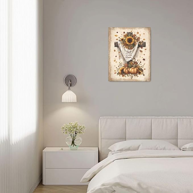 Christian Fall Wall Art Autumn Rustic Cross Sunflower Pumpkin Wall Decor Fall for Jesus He Never Leaves Pictures Painting Print Framed Artwork Decorations Gifts for Living Room Bedroom Prayer Room Office 16"x20"