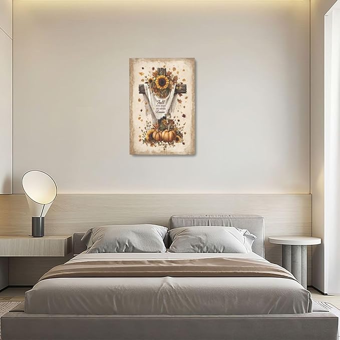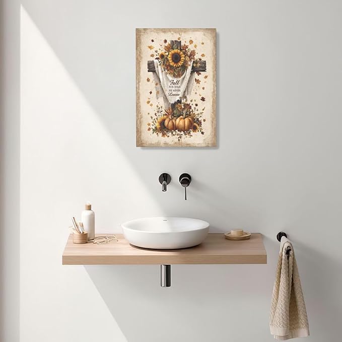 Christian Fall Wall Art Autumn Rustic Cross Sunflower Pumpkin Wall Decor Fall for Jesus He Never Leaves Pictures Painting Print Framed Artwork Decorations Gifts for Living Room Bedroom Prayer Room Office 16"x24"