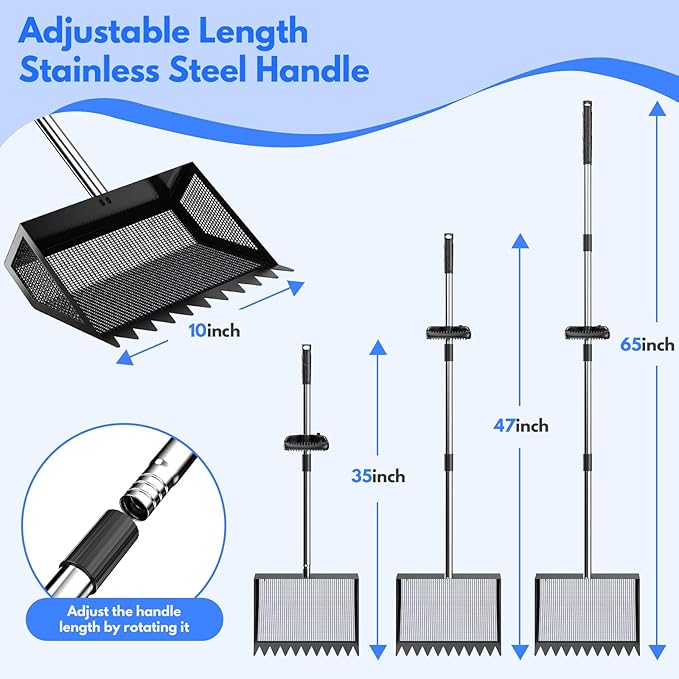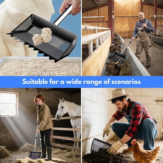 - Large-Capacity Metal Chicken Poop Scooper : Constructed with a heavy-duty metal shovel head and rake, paired with a 304 stainless steel handle and an adjustable soft rubber grip, it is suitable for use year-round. The metal-toothed chicken manure shovel head measures 10 inches in width, with a curved groove design significantly increasing the shovel's capacity, enabling it to scoop and sift waste in a single pass, greatly enhancing work efficiency.