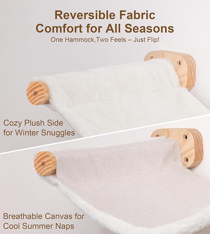 - Reversible & All-Season Cat Hammock: Dual-Sided Fabric for Year-Round Comfort; Our wall-mounted cat hammock features a reversible bed surface: breathable cotton canvas for spring and summer, and cozy plush fabric for fall and winter; Whether your cat loves to stay cool or snuggle up, this cat wall hammock delivers comfort in every season; Plus, the double-stitched edges ensure long-lasting durability.